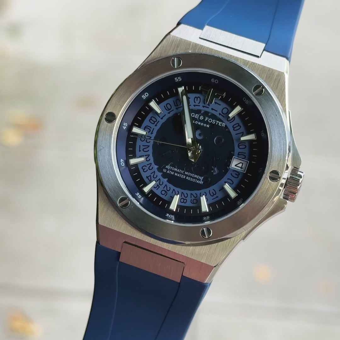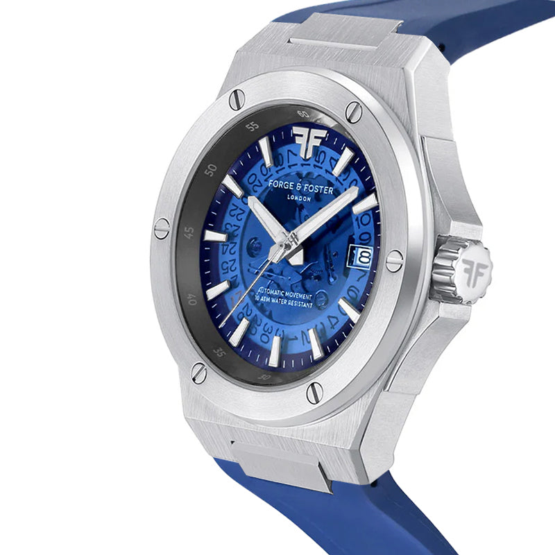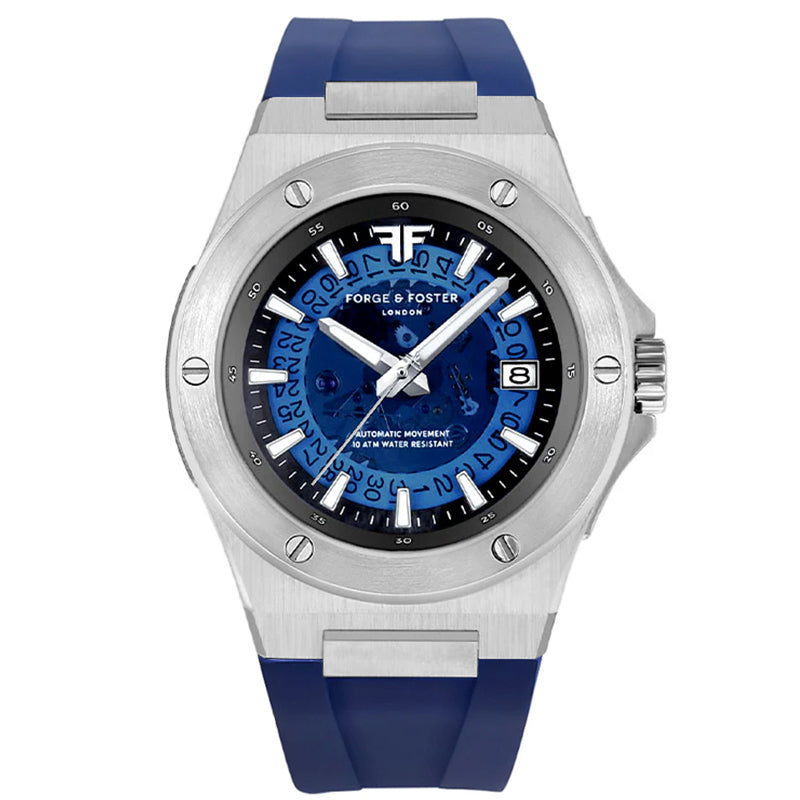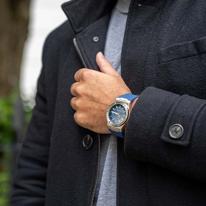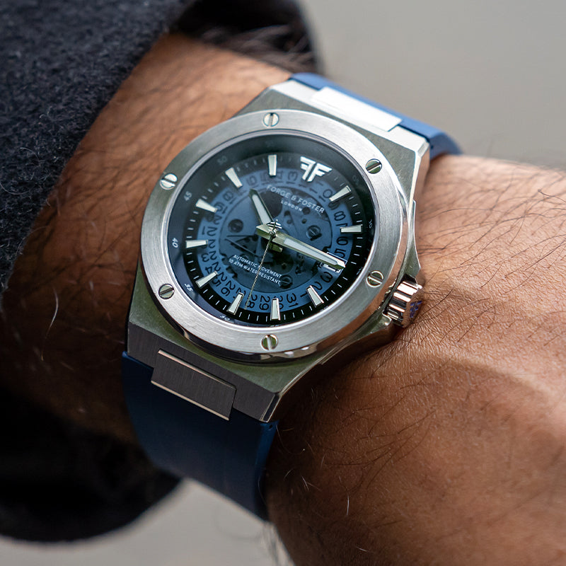 The Azure is our hybrid take on the integrated steel sports watch -- providing the bold skeleton design you know and love from us. It features a 42MM 316L casing with an integrated rubber strap that can also be swapped with one of our signature steel bracelets.
