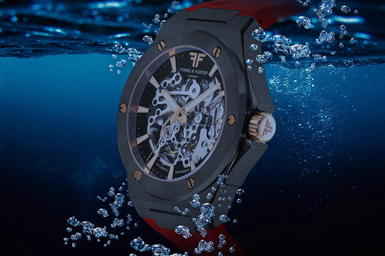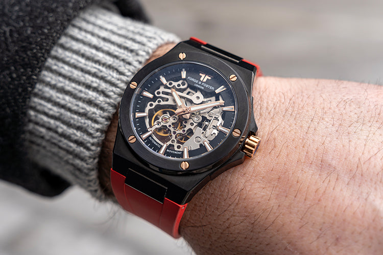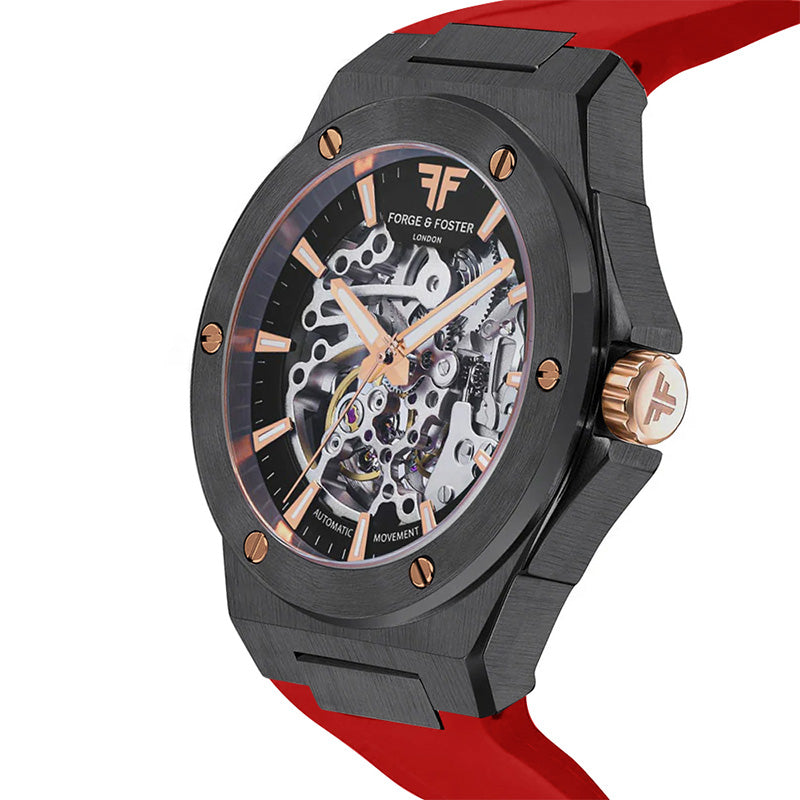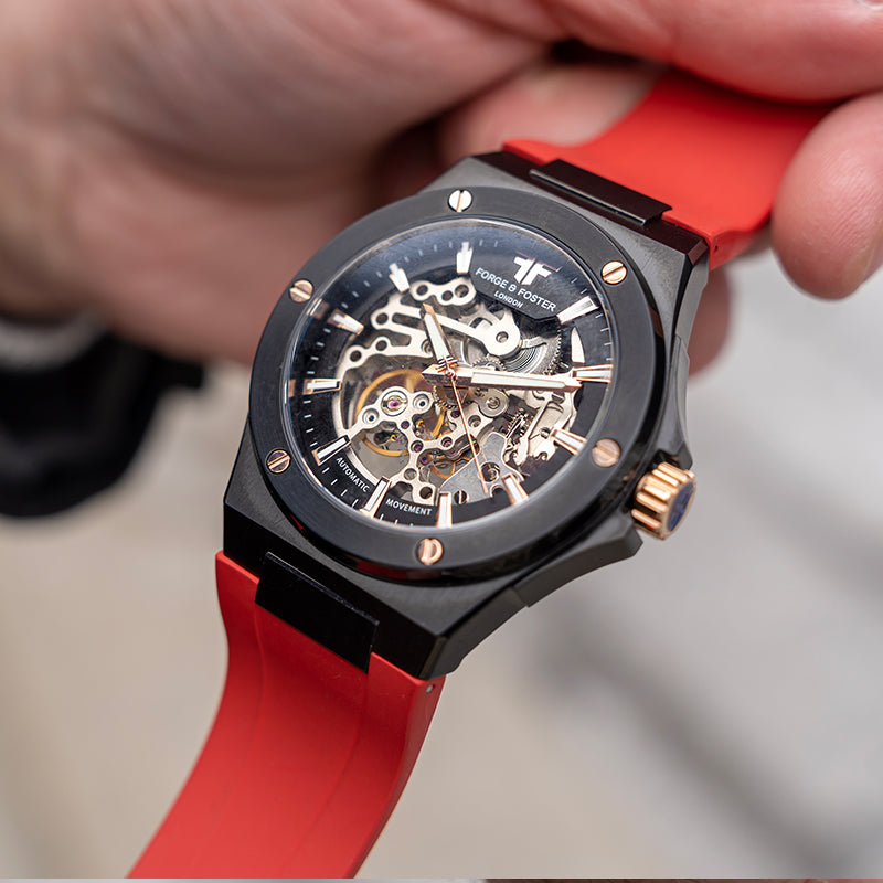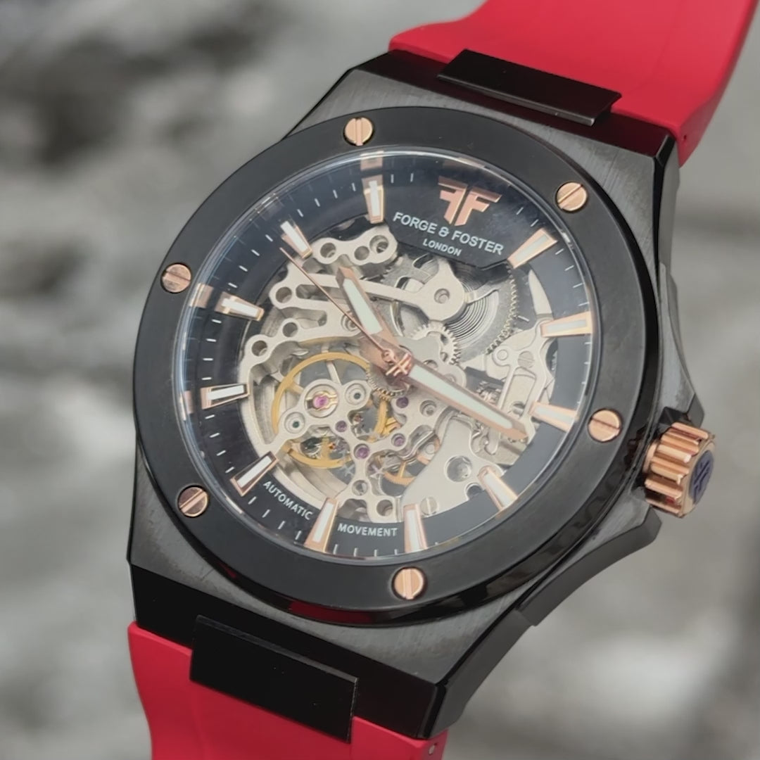The Phantom Red is the 2nd generation of the Avantian X watch line, featuring a skeleton automatic movement with 21 jewels, 41 hour power reserve (powered by you), sapphire glass (front and back) and a red FKM rubber strap.