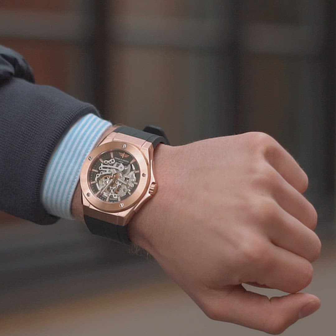Avantian X is our latest avante-garde design featuring a skeleton automatic movement with 21 jewels, sapphire crystal glass (front and back), a 41 hour power reserve (powered by you), and a black vulcanized FKM adjustable rubber strap that fits for most wrist sizes.