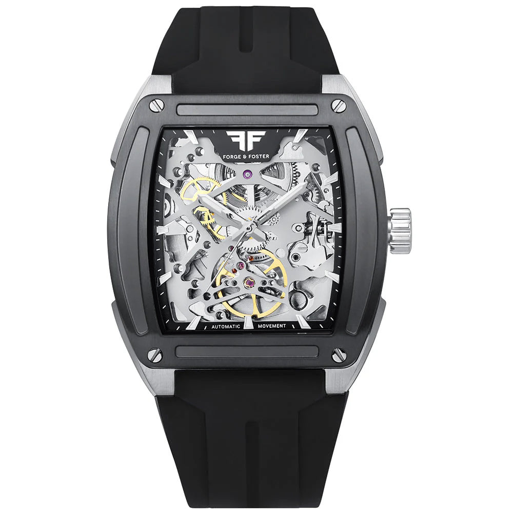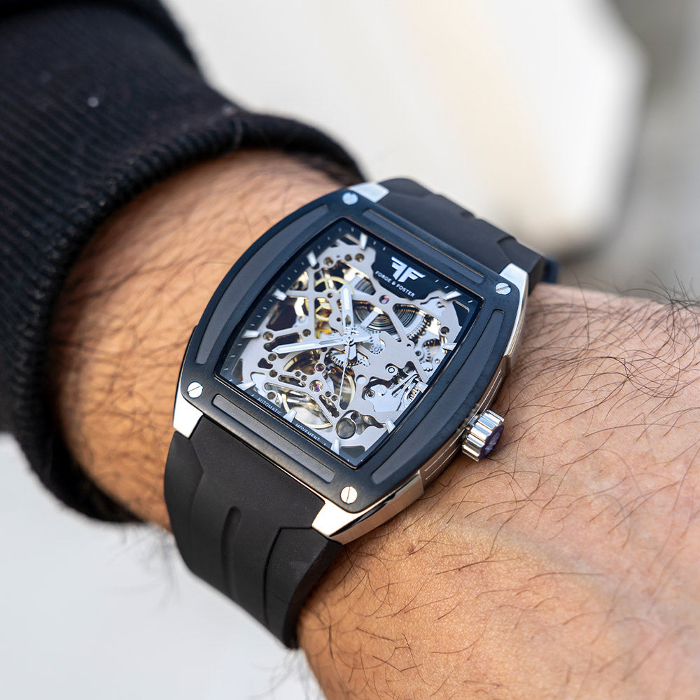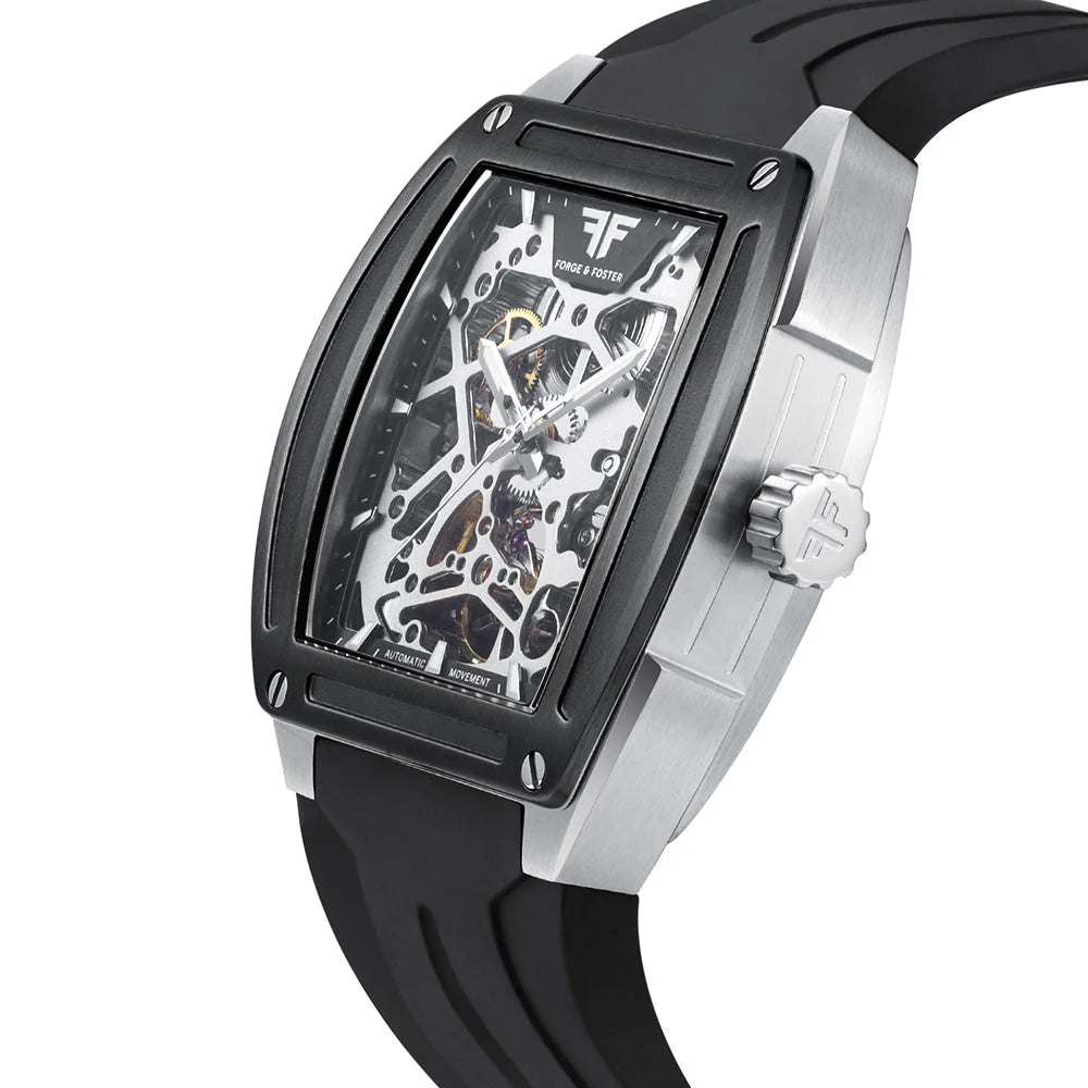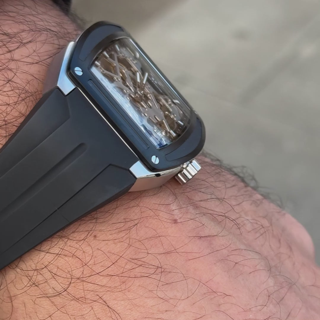 The Titan X series is our skeletonized version of the Titan, combining the same sport & style in a 41mm casing with a vulcanized rubber strap that fits any wrist size. The watch is a 20-jewel automatic movement with a 42 hour power reserve, powered by kinetic movement or self-winding.