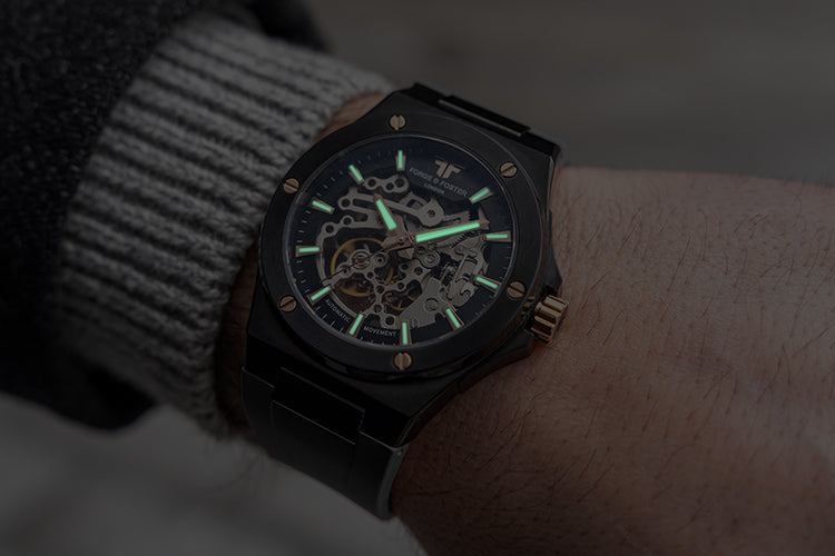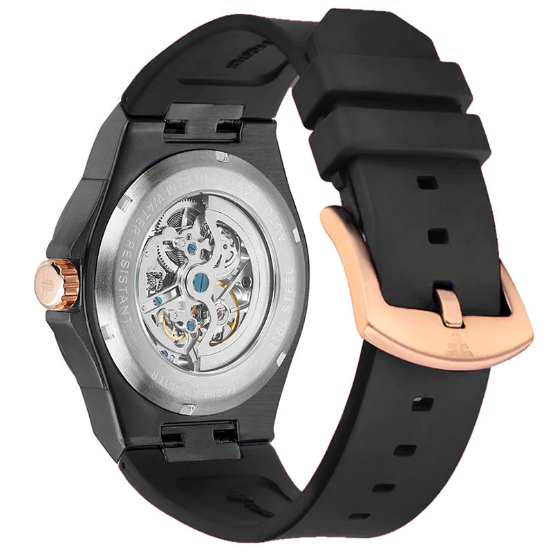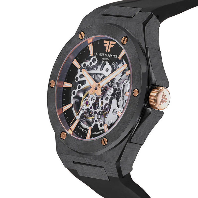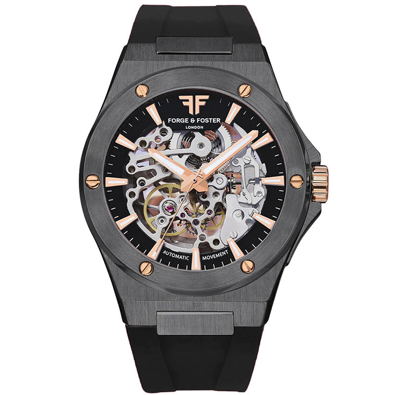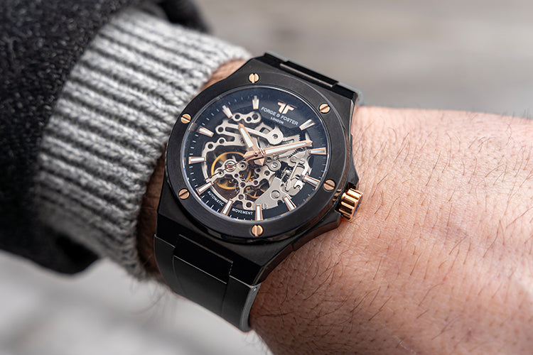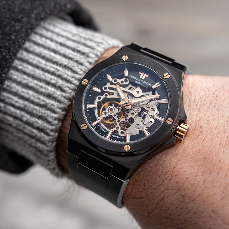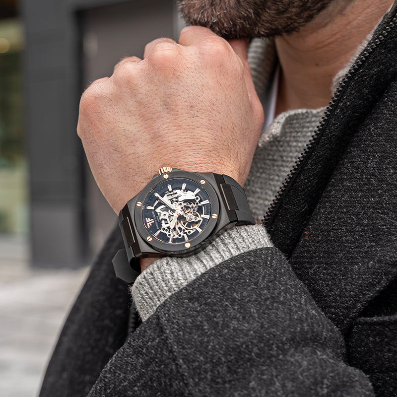 The Phantom is the 2nd generation of the Avantian X watch line, featuring a skeleton automatic movement with 21 jewels, 41 hour power reserve (powered by you), sapphire glass (front and back) and a black FKM rubber strap.