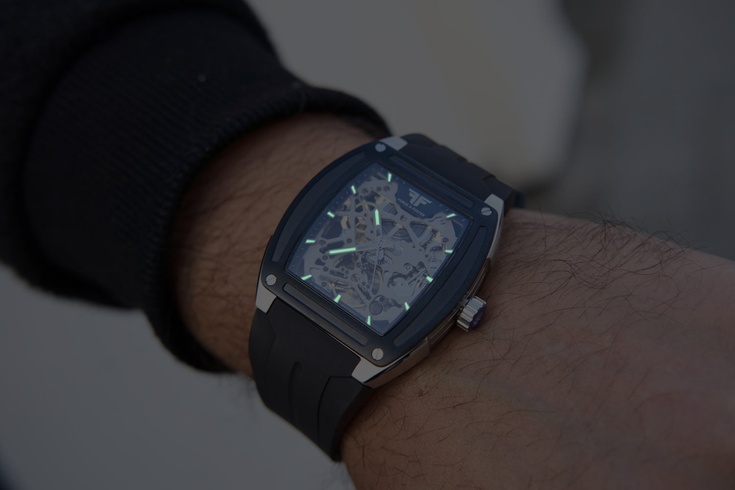 The Titan X series is our skeletonized version of the Titan, combining the same sport & style in a 41mm casing with a vulcanized rubber strap that fits any wrist size. The watch is a 20-jewel automatic movement with a 42 hour power reserve, powered by kinetic movement or self-winding.