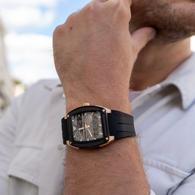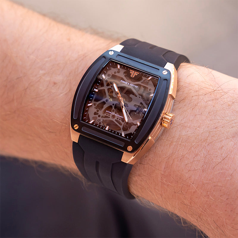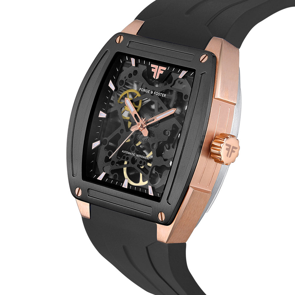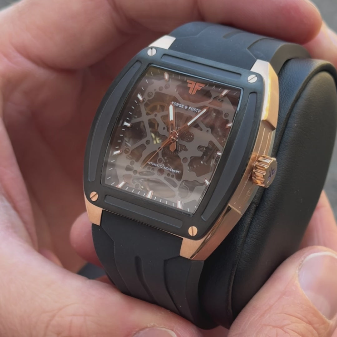 The Titan X series is our skeletonized version of the Titan, combining the same sport & style in a 41mm casing with a vulcanized rubber strap that fits any wrist size. The watch is a 20-jewel automatic movement with a 42 hour power reserve, powered by kinetic movement or self-winding.